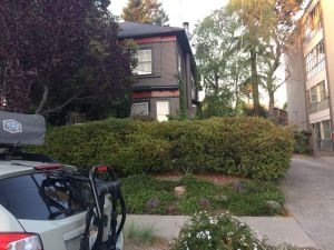 We planted some redwoods–such lovely trees– between us and the student apartments next door. “Madness,” said a friend who knew California as only a midwestern native could. “They are just giant weeds.” Years later, as redwood roots grew intimate with the neighbors’ plumbing as well as ours, the redwoods were taken over by two nests, one crows’, one squirrels’. In the spring we sometimes heard squirrely sounds of rutting, but more often it was hard to distinguish the angry scolding of a squirrel from the assertive cawing of a crow. All of them fled during the traumatic tree work, but they seem to be returning, if only to check out the new perch of the plaster seagull above the porch.