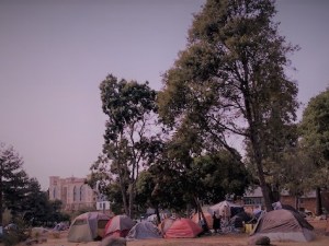 Tent city in Golden Gate Park after 1906 earthquake. Many sought medical help from the hospital at the Parnassus campus, visible in distance.