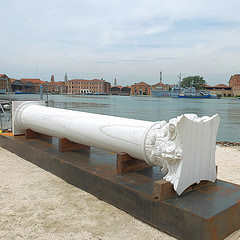 On the Arsenale embankment is a recumbent classical column that is connected with the Biennale’s Albanian exhibit. A documentary by Albanian exile artist Adrian Paci shows the quarrying of the marble block in China, its loading onto a freighter, and to cut costs, three Chinese carvers working the marble en route on the high seas. Paci thus addresses what we might call the downside of global trade and labor.