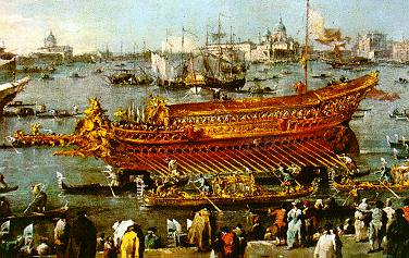 In Venice, every year after 1177, the doge sailed out into the lagoon on a seriously over-decorated ship called the Bucintoro, and tossed a ring into the waves to symbolize Venice’s wedding with the sea. After Napoleon had carried off the Lion and Horses of St. Mark and the choicest artworks in the city, the French set the last Bucintoro afire where all in the city could see it burn, on the island of San Giorgio Maggiore. And there the canny French sieved the ashes to save the gold.