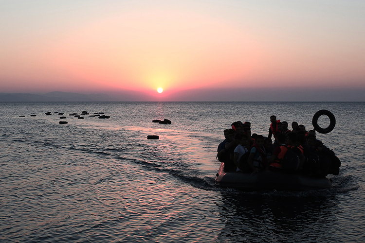 Migrants riding an inflatable boat approach the Greek island of Kos after crossing a part of the Aegean Sea between Turkey and Greece on August 13, 2015. Greece sent extra riot police to Kos as tensions mounted over a huge influx of migrants. The Greek government said it was “immediately” dispatching a ship to Kos to double up as an accommodation and processing centre for up to 2,500 people as around 7,000 migrants wait to apply for immigration papers. AFP PHOTO / ANGELOS TZORTZINIS (Photo credit should read ANGELOS TZORTZINIS/AFP/Getty Images)