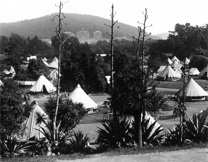 Tent city in Golden Gate Park after 1906 earthquake. Many sought medical help from the hospital at the Parnassus campus, visible in distance.